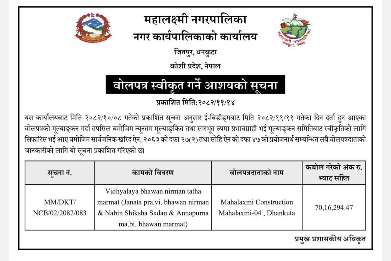 बोलपत्र स्वीकृत गर्न आशयको सुचना ।